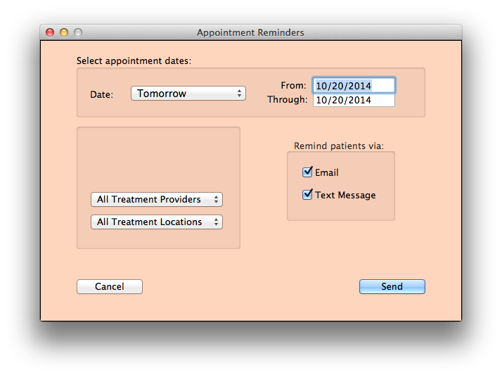 Simply select SEND APPOINTMENT REMINDERS from the new Actions menu, select the appointment dates for which you want to send reminders, and click SEND.