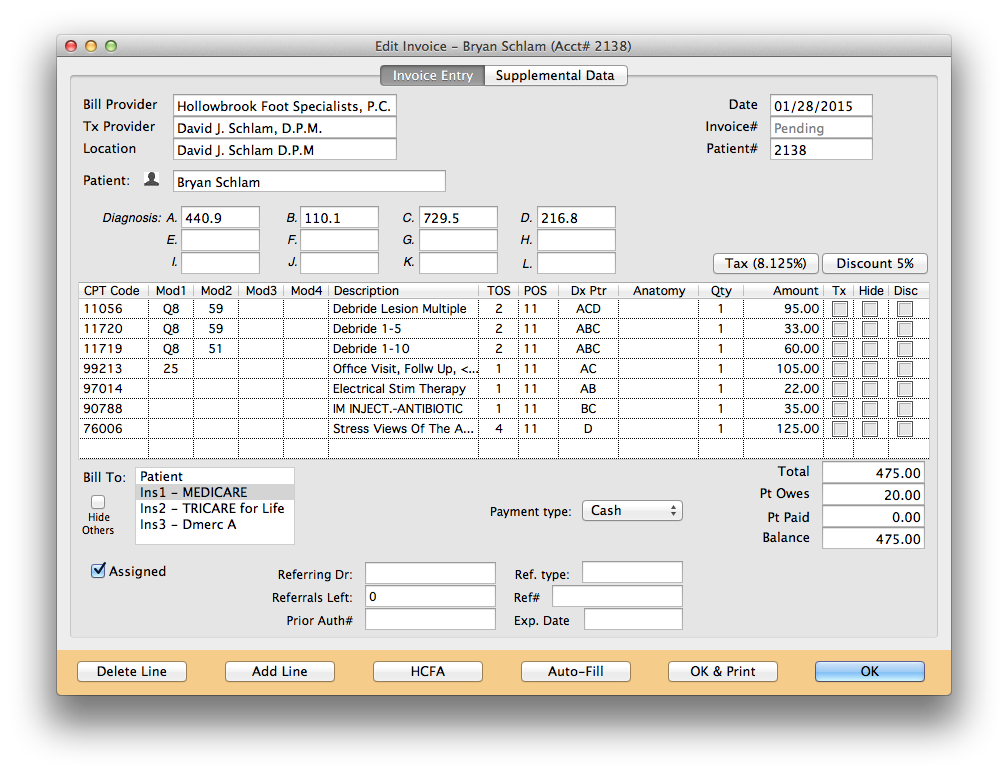 This invoice would take a long time to enter. There are four diagnosis codes, a bunch of modifier codes, and each line has to have a diagnosis pointer associated with the correct CPT code.